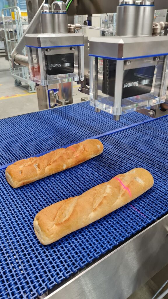 Der Brot-Roboter muss beispielsweise wissen, wie hoch das Brot ist, wo sich dessen Mitte befindet (längs und quer) und ob es eventuell schräg auf dem Band liegt. All diese Informationen liefert der OXM dank integrierter Mess- und Auswertefunktionen. Das bedeutet, dass die gesamte Berechnung der Messwerte im Sensor erfolgt. Der smarte Profilsensor liefert die errechneten Koordinaten schon in der gewünschten Einheit, z.B. mm. Im Fall der Sandwich-Linie misst der OXM die Höhe und sämtliche Kanten des Brotes und berechnet daraus die Brotmitte. So können die Sauggreifer die obere Hälfte an der idealen Stelle beschädigungsfrei abheben.